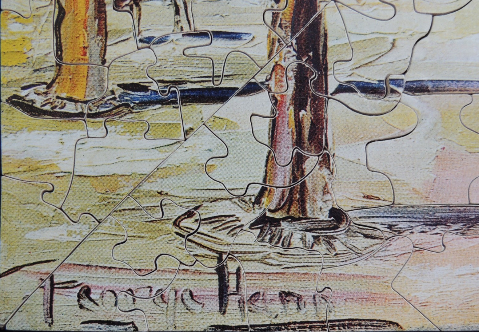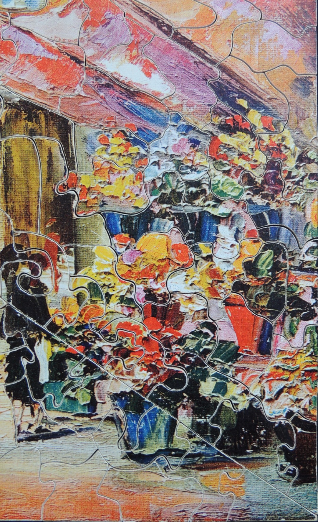 Very colourful plywood jigsaw puzzle cut by Eric for the jigsaw library and estimated to be of c1970s-1980s manufacture. It features colour line-cutting at just about every opportunity, with combined styles of interlocking and push-fit pieces, coupled with a highly original division into four, almost triangular sections. These serve to provide a very large number of straight edge pieces, probably aimed at enhancing the challenge of this relatively small puzzle.