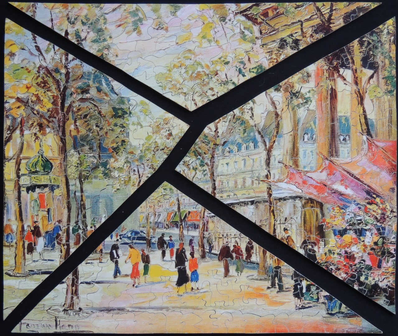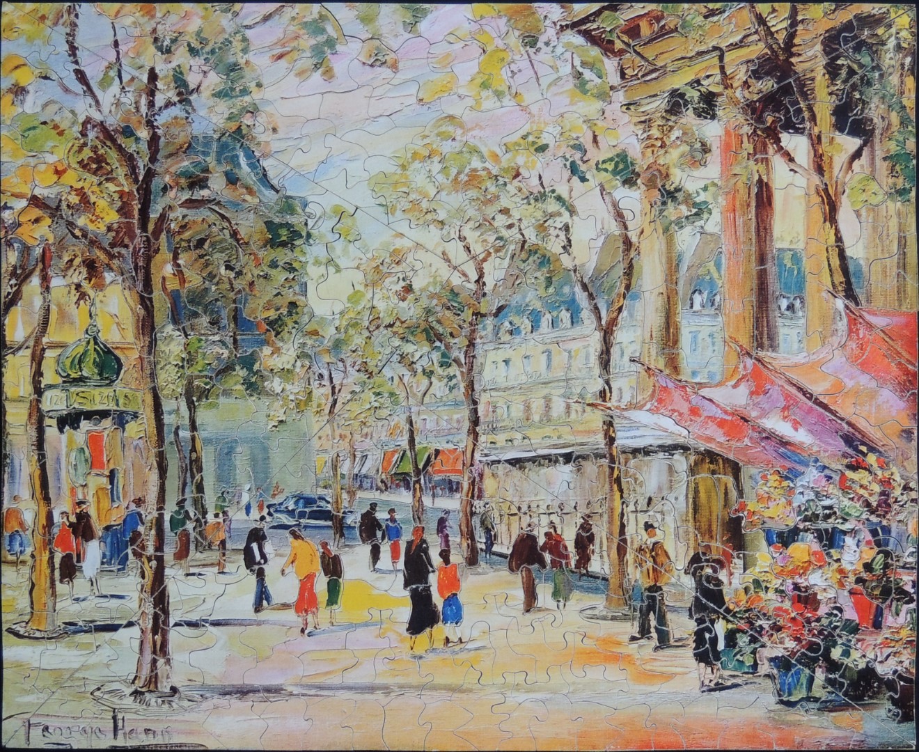 The painting is a bright and cheery depiction of Place de la Madeleine in Paris, by the British artist George Hann (1900-1979). Several other puzzles featuring this artist's work can be seen here